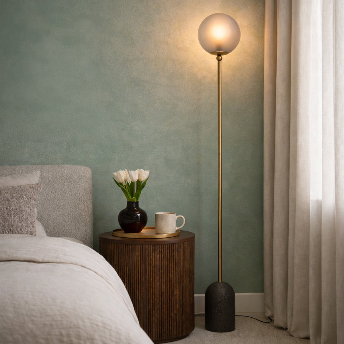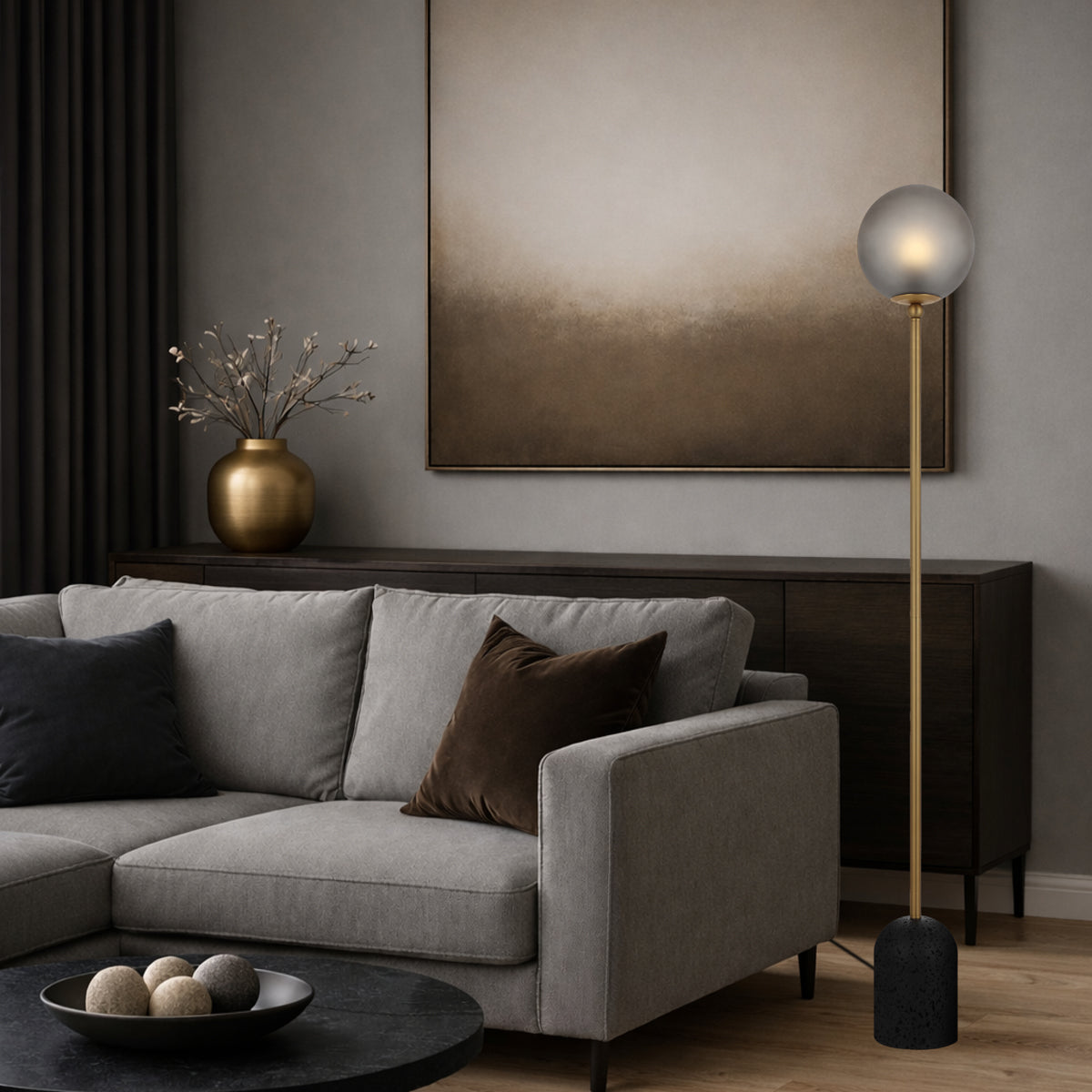 The Gina floor lamp effortlessly blends modern design with timeless elegance. Featuring a durable travertine base and graceful glass sphere shade, it is also available as a table lamp and comes in two stylish colourways—classic neutrals or bold hues.